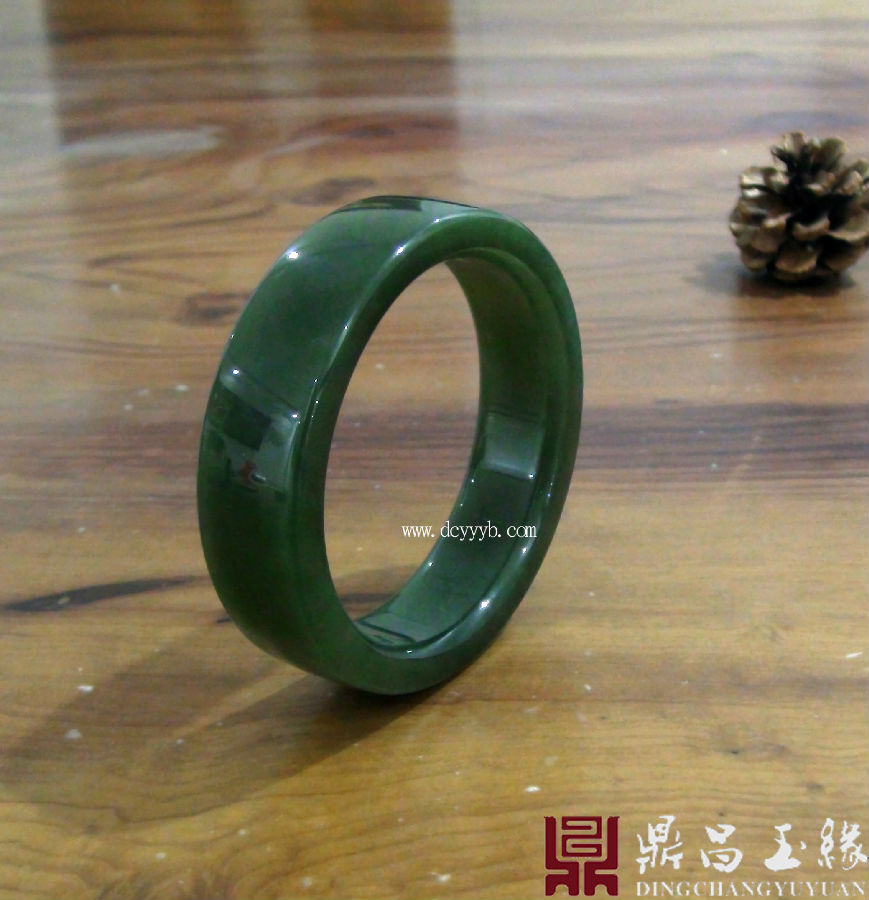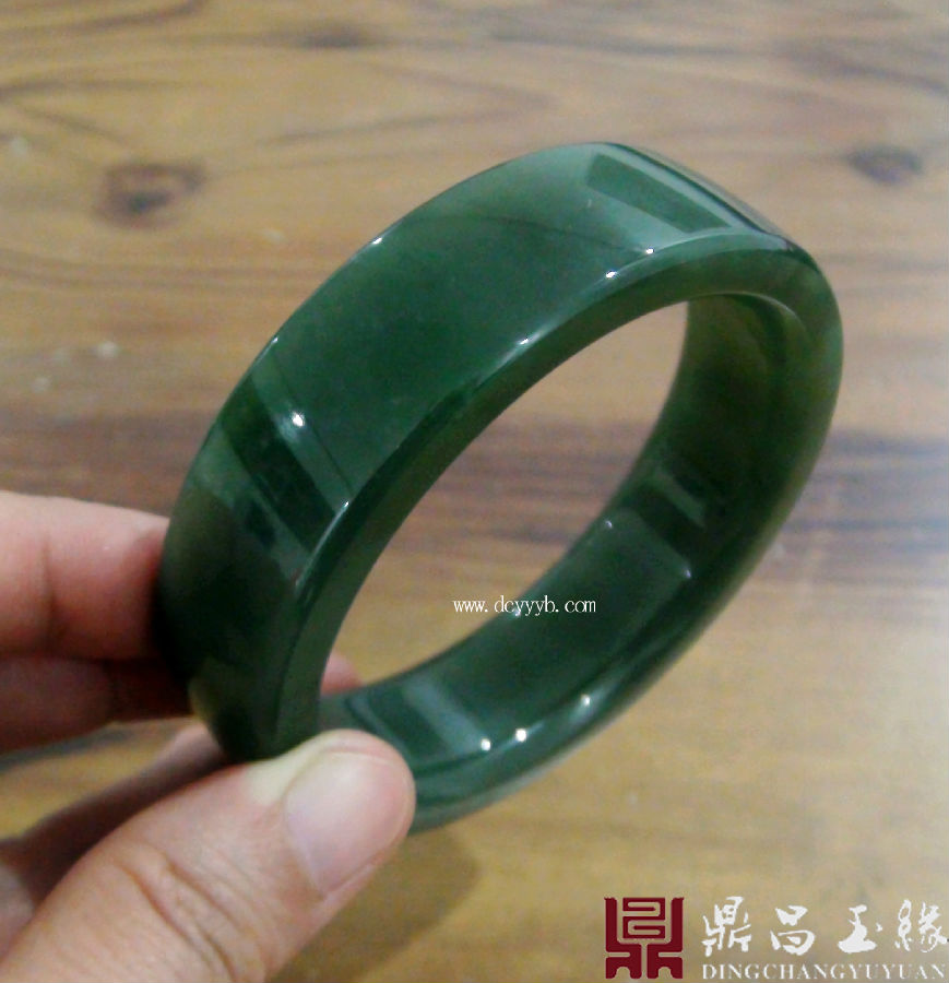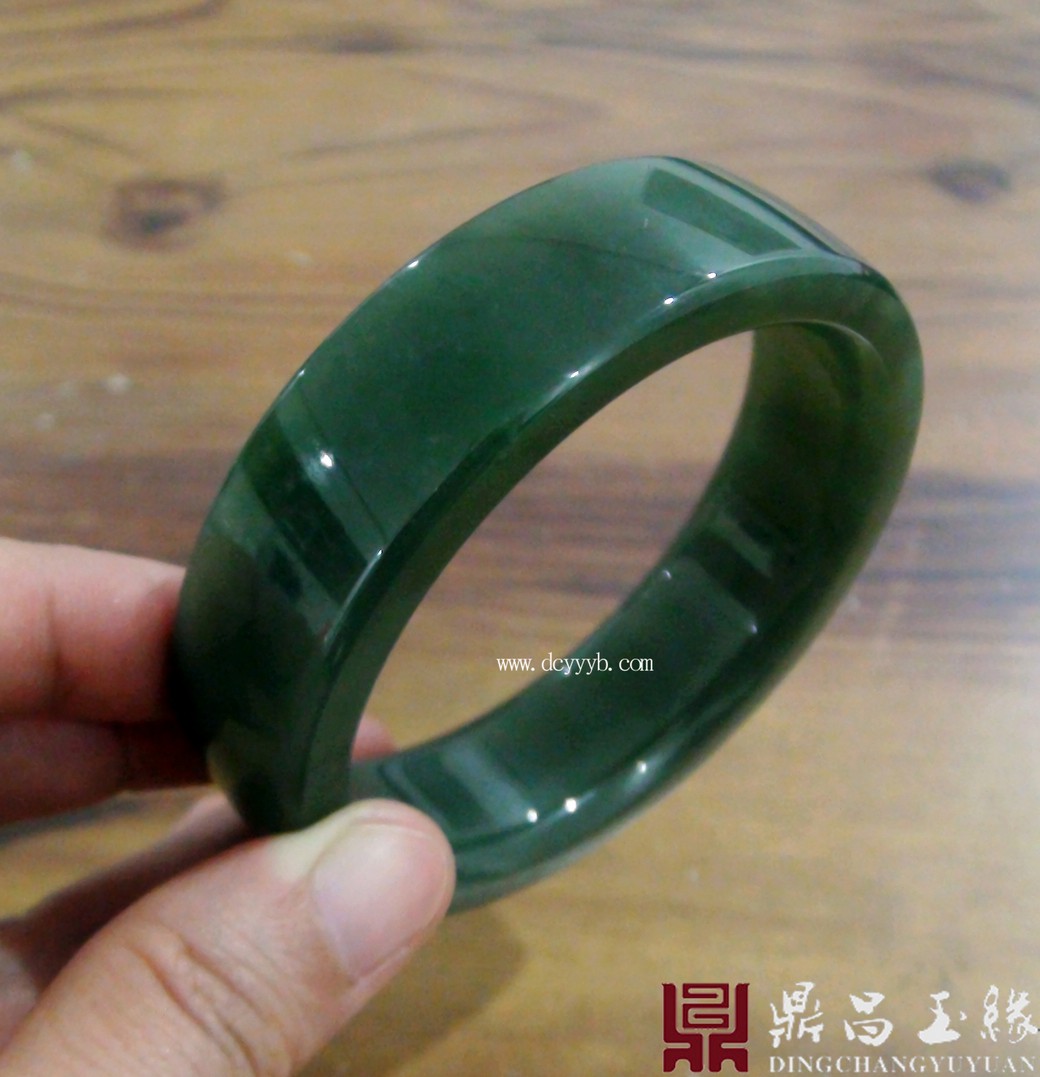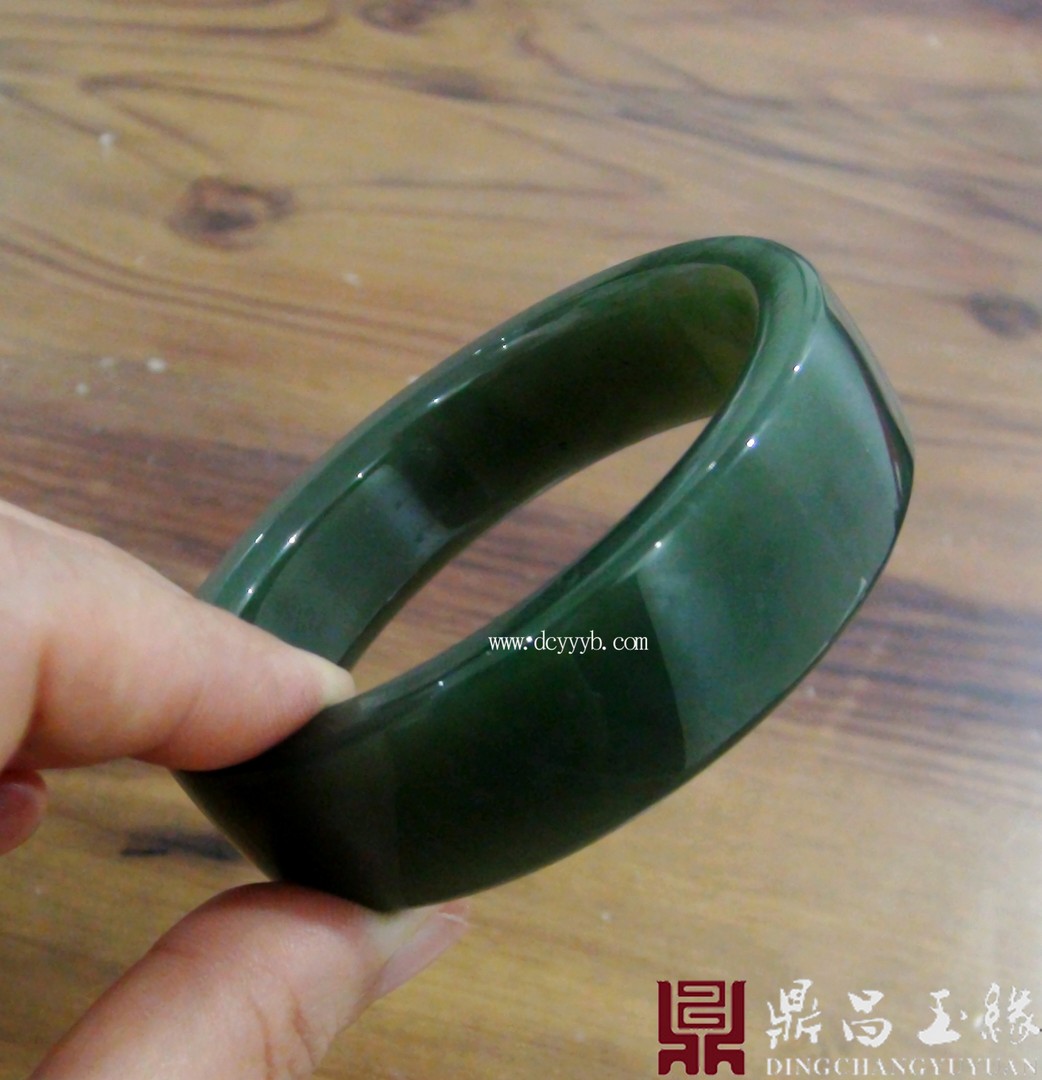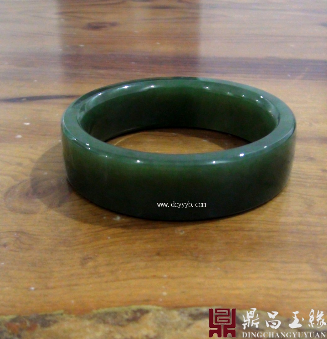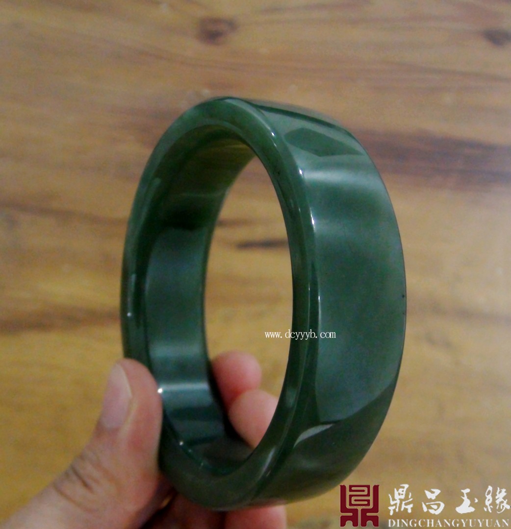 新疆和田玉碧玉手镯,色泽浓郁,油润光滑,萦绕于腕,高雅大气。整器抛光精美,光泽夺人眼球,玉料圆润厚实。造型为齐棱样式,佩戴大方,简约典雅。