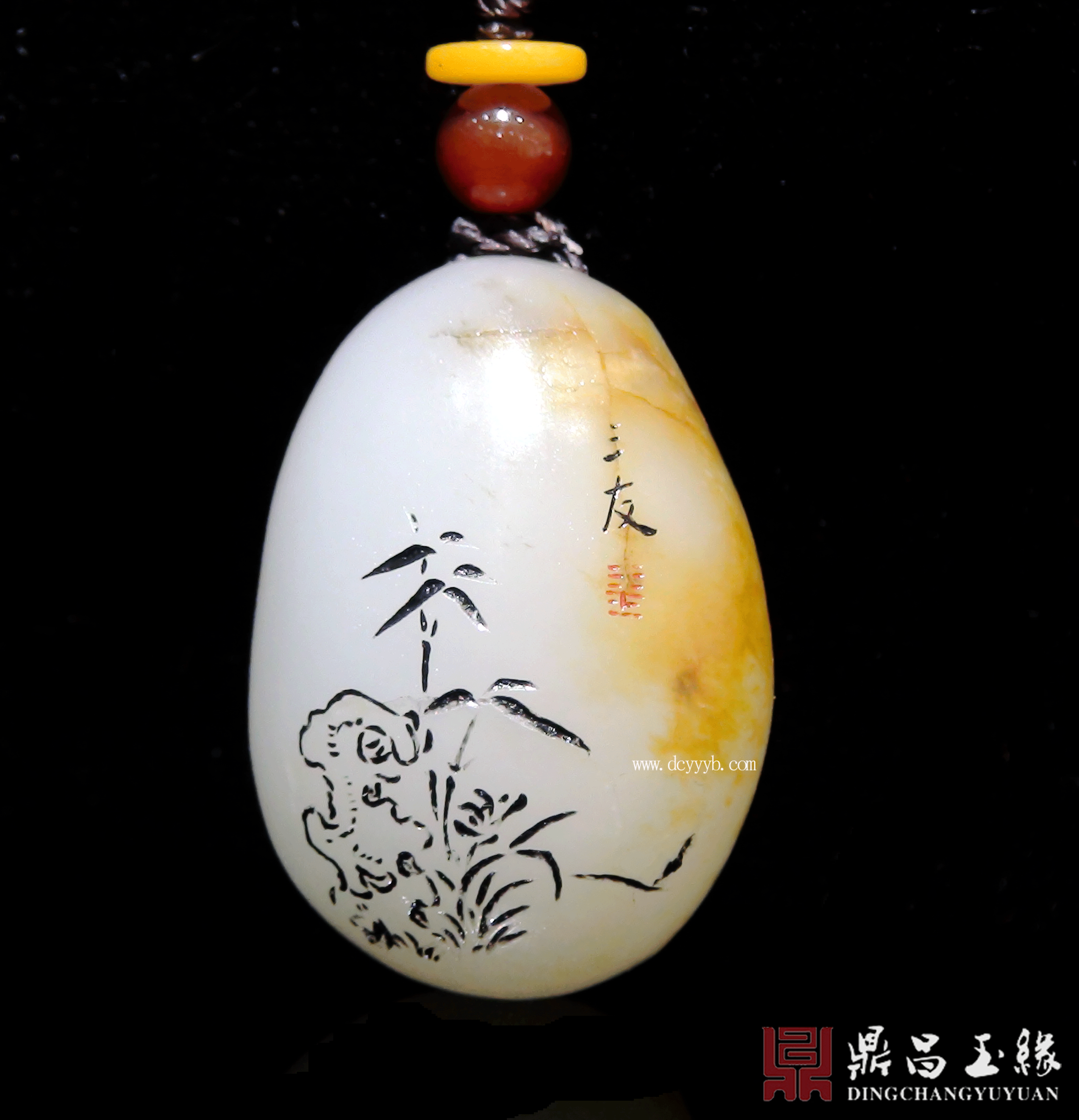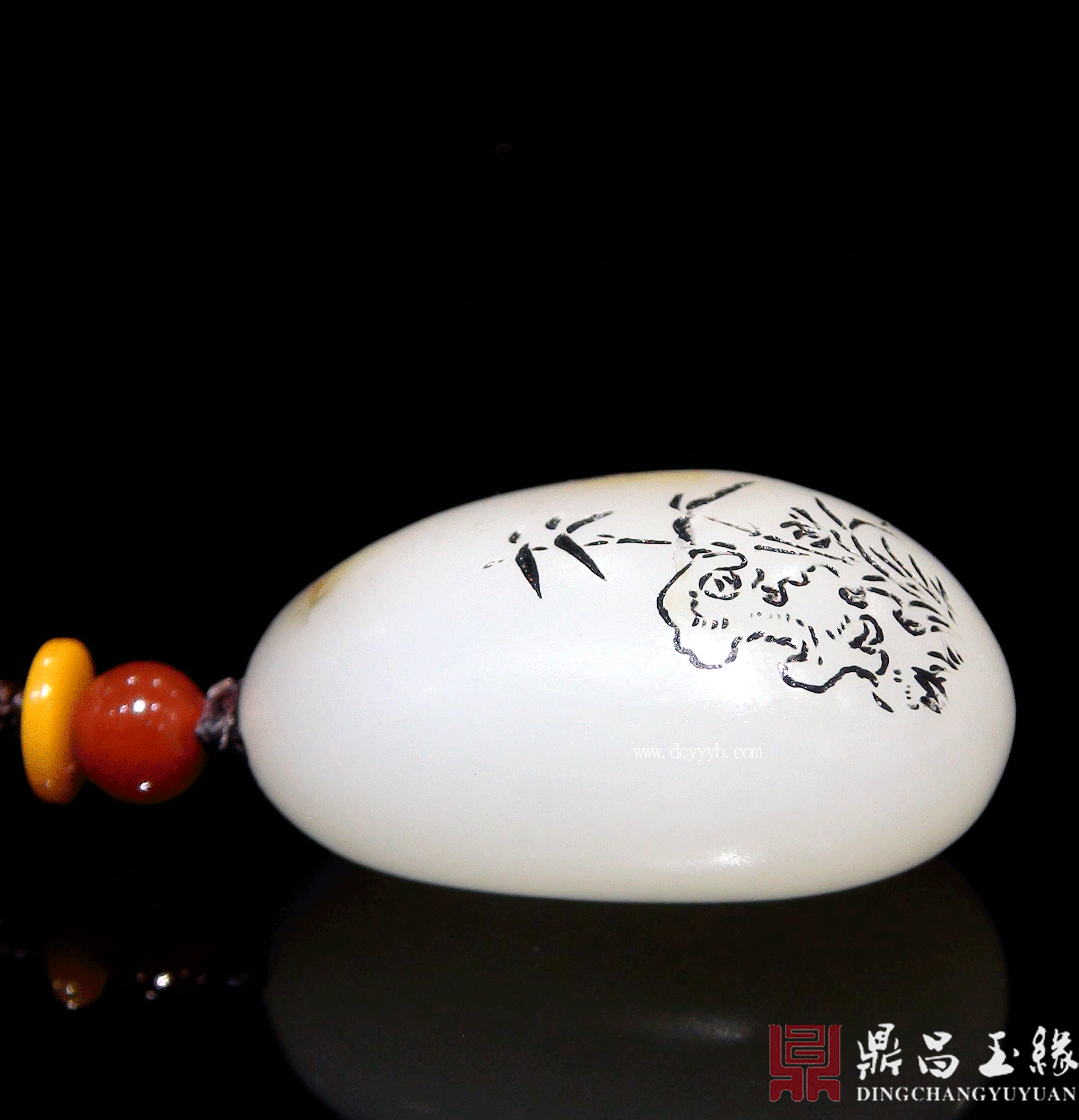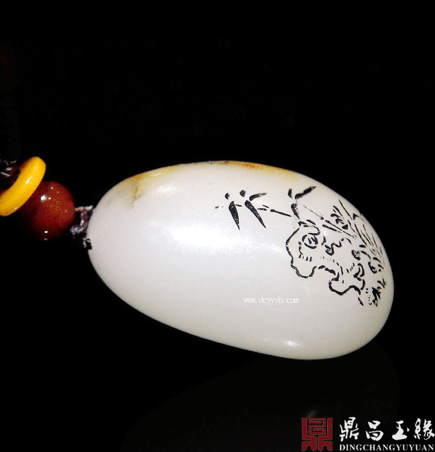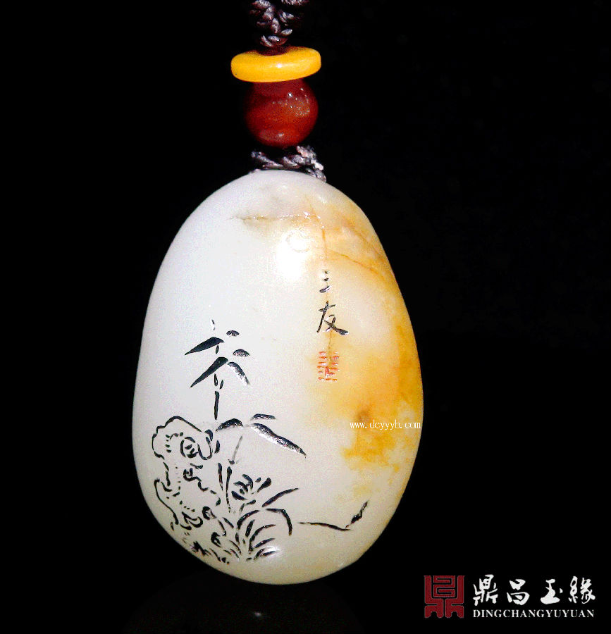 新疆和田玉小籽料,皮色亮丽,外形圆润,质地细腻白皙,玉质凝聚莹润,手感顺滑,正面浅浮雕有松、竹、梅,因这三种植物在寒冬时节仍可保持顽强的生命力而得名,称之为岁寒三友,是中国传统文化中高尚人格的象征,传到日本后又加上长寿的意义。