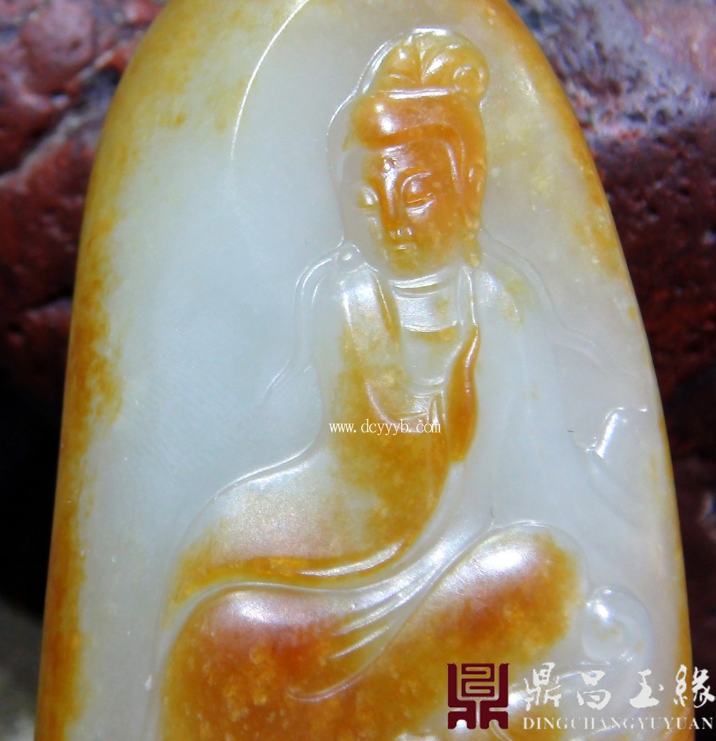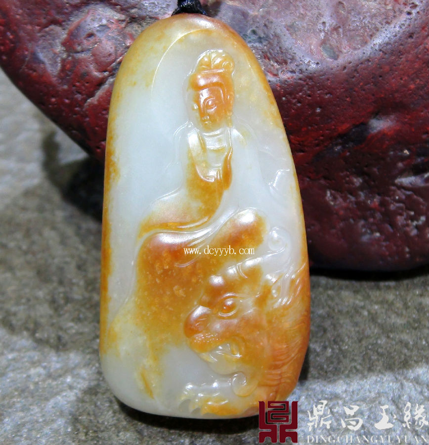 新疆和田玉白玉籽玉作品,质地莹润,油亮色泽,成色均匀,皮色靓丽。此件玉雕文殊菩萨,是如来佛祖之一。文殊菩萨又称“法王子”。为智慧之象征,身紫金色,形如童子,能斩群魔,听一切烦恼,象征所具无上智慧。