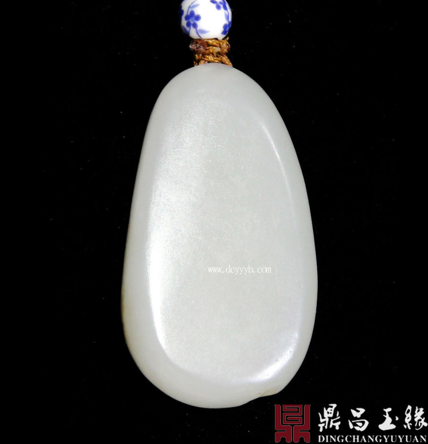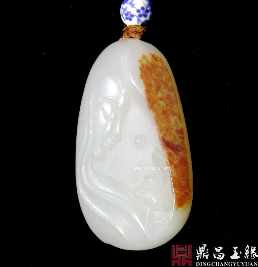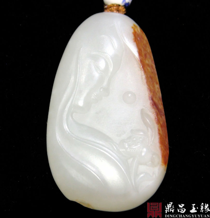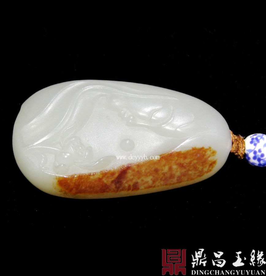新疆和田玉白玉挂件,质地莹润,油亮色泽,成色均匀,温婉柔和,古朴淡雅,轮廓圆顺。此件作品玉面精雕侧观音像,观音的面容慈爱安详,目光低垂,俯视芸芸众生。雕刻线条流畅,工法细致,将观音大慈大悲,普度众生之态表现得淋漓尽致。寓意着吉祥平安,无祸无灾