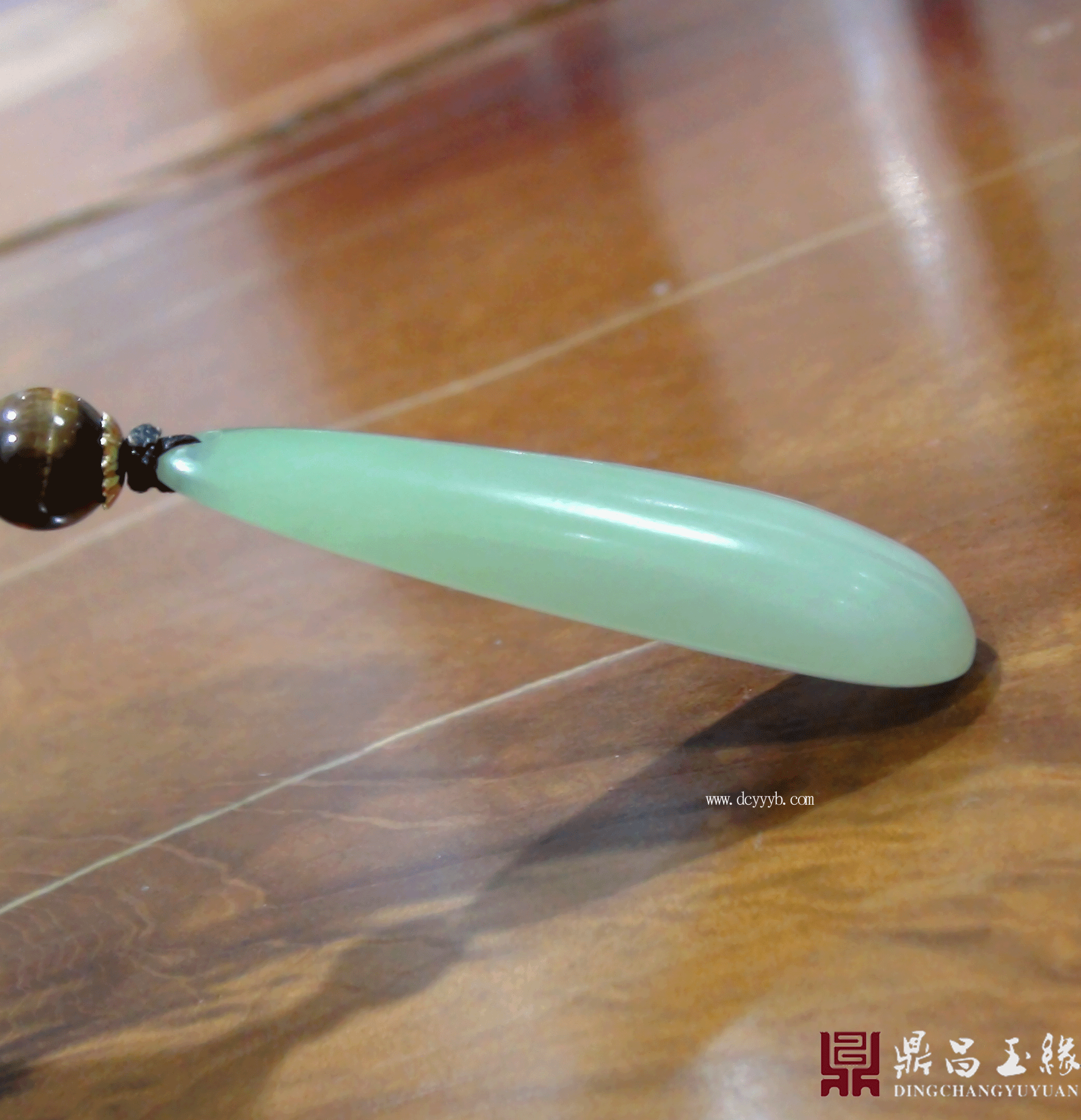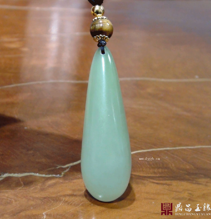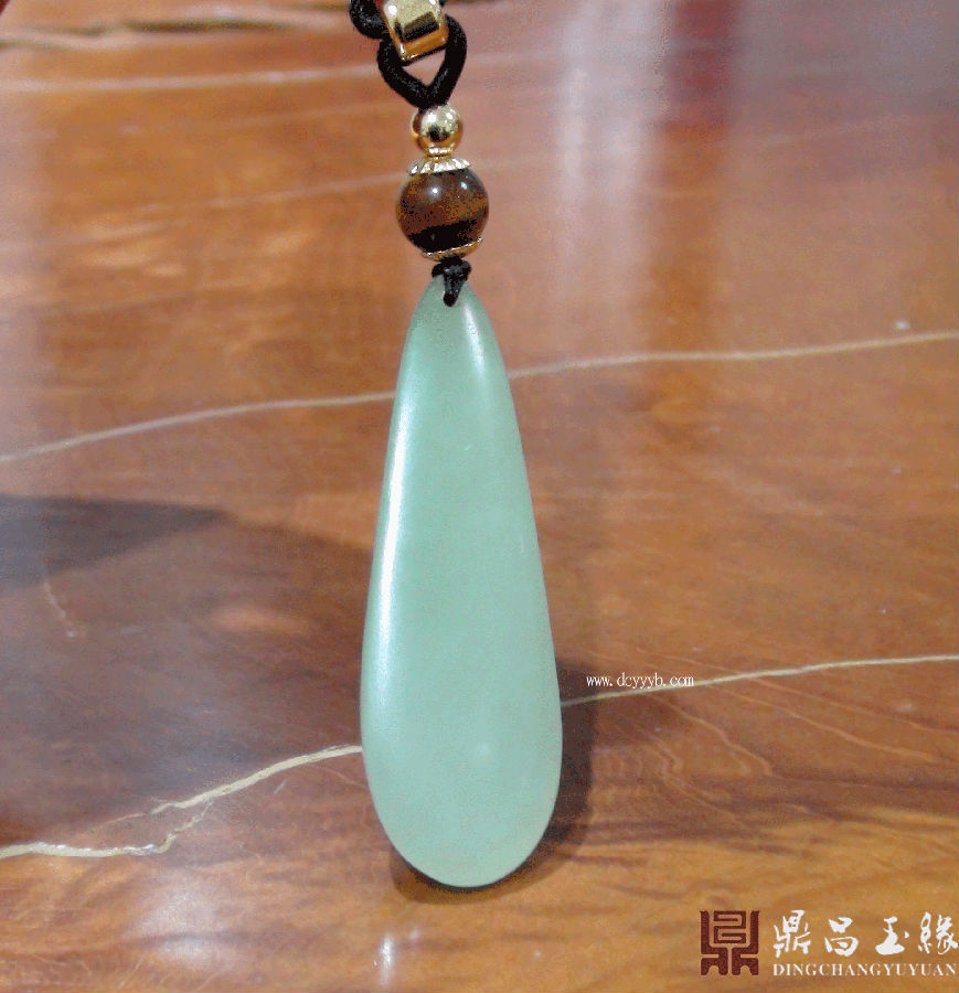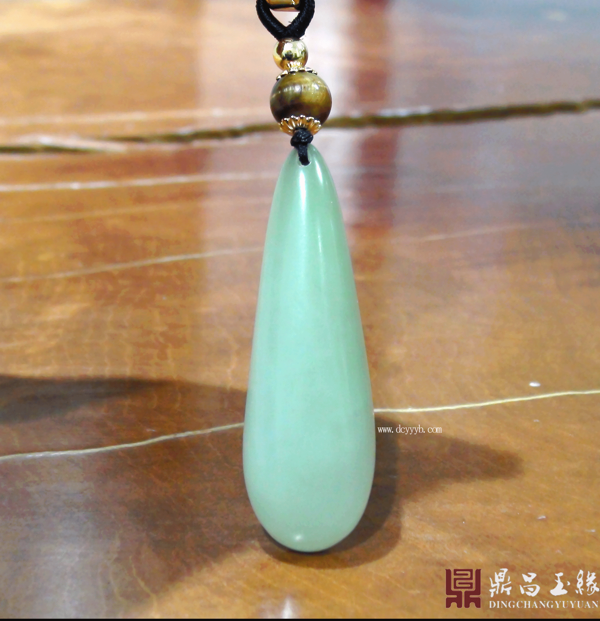 新疆和田玉翠青挂件,玉质紧密细腻,光泽亮丽,油润柔和,玉质醇厚,成色娇翠,鲜亮明快。此玉件形似一滴水,形状周正圆润,弧面平滑丰满。寓意着坚持不懈,滴水穿石。也有纯真爱情的蕴意。