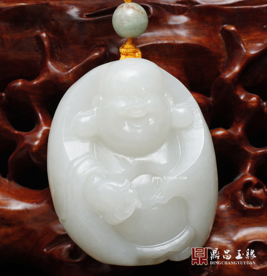 新疆和田玉籽料白玉把件作品,质地莹润,油亮色泽,成色均匀,温婉柔和,背面覆黄皮,皮色亮丽,娇俏可人。随形雕弥勒,手持宝珠,身宽体胖,身形稳健,笑容满面,气态祥和。雕刻精细,简约传神,线条流畅,布局合理有序,工艺精美。寓意弥勒招财进宝,吉祥如意。
