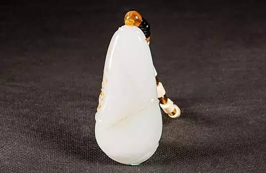 一块和田玉料。取表面皮色巧雕一株树苗依靠一粗壮的竹子茁壮成长,侧面俏色雕琢一只蝙蝠飞舞萦绕。背面的水线也巧妙的用作竹节,如下图。