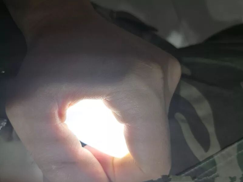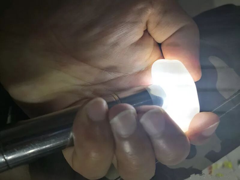 料子过灯来看,没有一丝阻碍,完完全全的大灯泡,里面的结构和籽料完全不一样,它是那种颗粒状结合结构,只要轻轻打灯测光可以很容易的看到。
