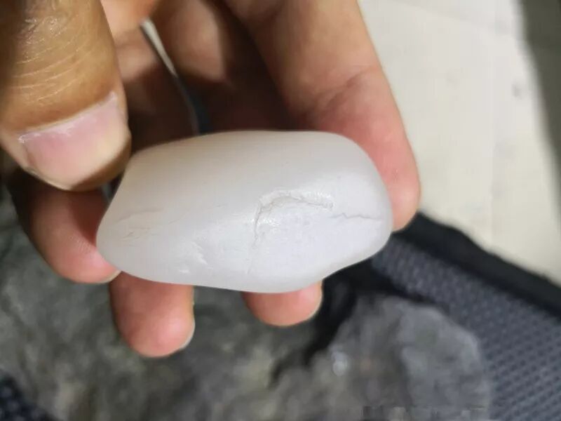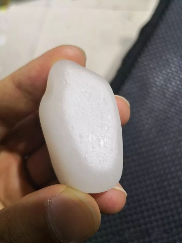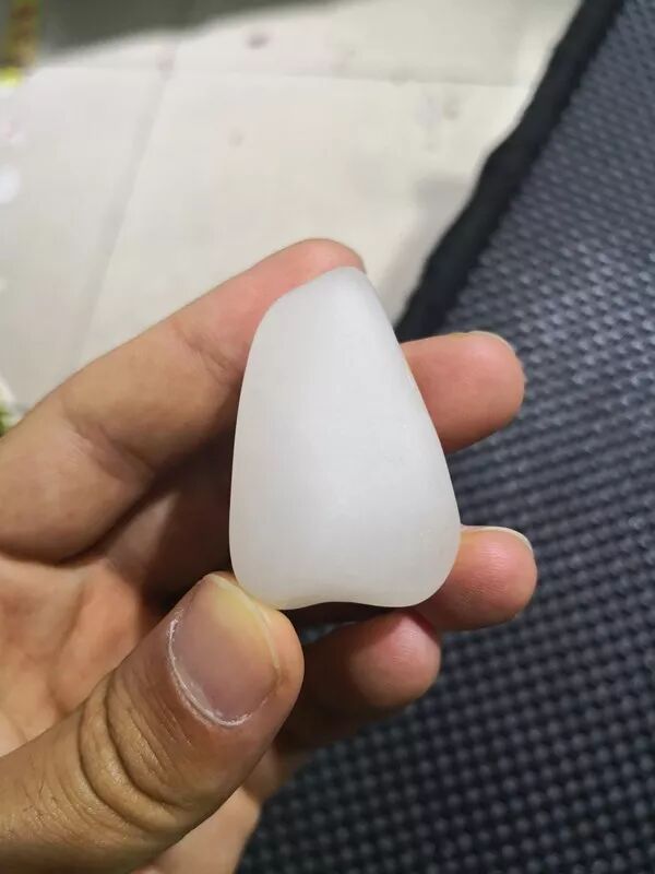拿在手里感觉就出来了:相对于籽料来说,这种石头拿在手里,感觉是轻飘飘的,没有籽料的压手感和厚重感,密度较低,质量不够且脆性大。拿在手里握了一阵都感觉很干涩,没有油性,料子看起来没有光泽感,更谈不上脂感细腻度了。从料子的色调来看,白度倒是挺白的,但这种白属于是冷白色调,给人一种不自然,不舒服的感觉,和籽料的白比起来,有点苍白无力,我们说的看起来没有灵气。