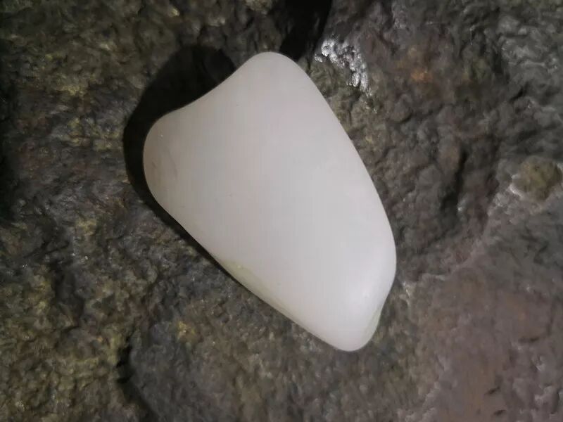 这是一块产自玉龙喀什河的水石,和籽料算是邻居,同样是来自河坝,来自大自然,它的主要成是蛇纹石或者石英,含有少量的方解石等多种矿物质。它和籽料的最大相似之处就在于外观,白度,硬度也不低,很多没有经验的新手玉友很容易把它当成籽料买了,还觉得自己今天捡了大漏??