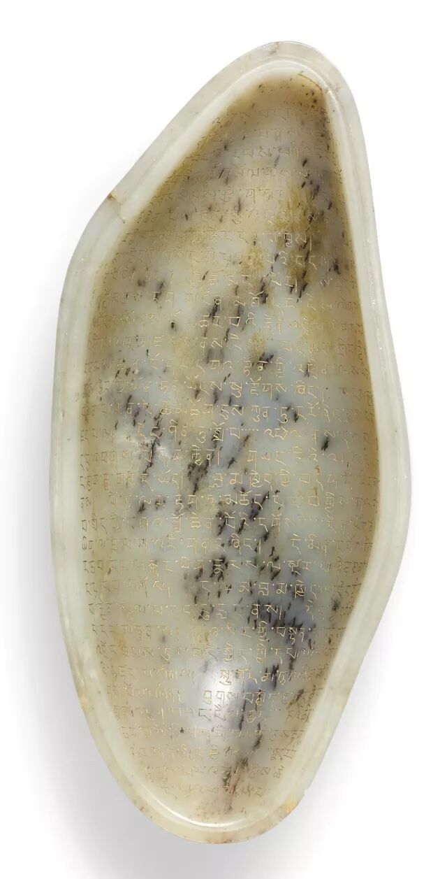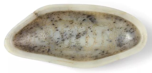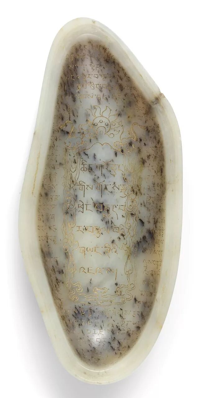 这就是那个红皮籽料了,光看图片,虽然皮色比较艳丽,但是我们能看到明显的黑点杂质以及裂纹。 然而身体“被掏空”后,打开是这样的: 可以说内部情况也是相当的不乐观,黑色杂质渗透严重。看到这里,可能很多人会说,这块料子也就皮色好一点,肉色泛青而且玉质极差,像极了咱们平时吃的火龙果,最多五位数顶天了。 然而这个籽料的故事还没有完。这是乾隆送给八世达赖喇嘛的一件宝贝。 清乾隆 御制青玉刻藏文敕封八世达赖喇嘛嘎巴拉式盖盒 估价:2,000,000-3,000,000 HKD 尺寸:14.6cm 成交价: 4,660,000 HKD (含买家佣金) 相关资料 此青玉盖盒,以整块籽玉留皮随形掏膛,精妙卓绝,盒内镌刻藏文,描以金漆,历史价值极高。此物见证汉藏文化交流,除拉萨所藏,难得一见,其重要性毋庸置疑。 此盖盒乃乾隆帝册封八世达赖喇嘛强白嘉措时,曾以此盒为赐,同赉玉印、玉册。玉册乃授命诏书,汉、藏、满、蒙四语写就,其文与此盒所铭别无二致。玉印、玉册原贮布达拉宫,现藏拉萨西藏博物馆。九世达赖喇嘛之经师、西藏摄政,以藏文为八世达赖立传,笔下提及三件玉宝,称此盒外如宝石,内藏金书,盒内镌刻藏文,描以金漆,拍品见证藏汉文化交流,不仅反映清廷与边疆关系,亦体现清王朝的权力伸展。 这300多万的籽料贵在哪 如果说以当下的眼光来看待的话,最能体现它价值的应该是它的皮色。可是我们都知道古人做玉不喜留皮,所以咱们现在看到的带皮古玉少之又少。 但是这块籽料,打破了我们的看法。古人喜欢籽料,也是喜欢皮色的(清乾隆时期带皮玉雕件为历史之最)。 尽管已经时过百年,可是这块料的皮色已经鲜艳如新,所以,真正的皮色是经得起时间的考验的,愈久弥新! 这块料由内而外都不是为一件好料,搁现在基本就是以废料处之,但是古人挖脏去绺,鎏金刻字为这块料赋予了新的生命。 这块料上的文字所包含的历史价值,远远的超过料子本身。就拿青铜器来说,有字和无字的价格差距是天壤之别。刻有文字的青铜器往往价值连城,视为国宝。古人常言的“一字千金”并不为过! 而且从工艺上看,这个籽料切开后仍然可以做到严丝合缝,对于当下的玉雕工艺可能都比较困难。在此,御府君也要向当年的乾隆工匠们致敬! 当然了,这块料另外一层价值,来自与乾隆名人身份的加持,乾隆爱与众所周知,宝剑赠英雄,宝玉赐喇嘛。套用金星大姐那句词就是 完美....... 也许,这样的红皮籽料,和很多玩家手里的藏料无法相比,有各种瑕疵绺裂,几乎看不到什么好玉质。但它的历史文化价值却是无可比拟的! 我们更应该关注的是它的历史文化,以及这个籽料说明的历史。这就是玉的另一种文化价值! 另一方面来讲,各位玉友是不是应该珍惜手里的籽料呢?也许你的籽料从玉质、皮色上要比它好的多,所以好好珍惜手中的籽料吧!没准百年之后,视若珍宝!