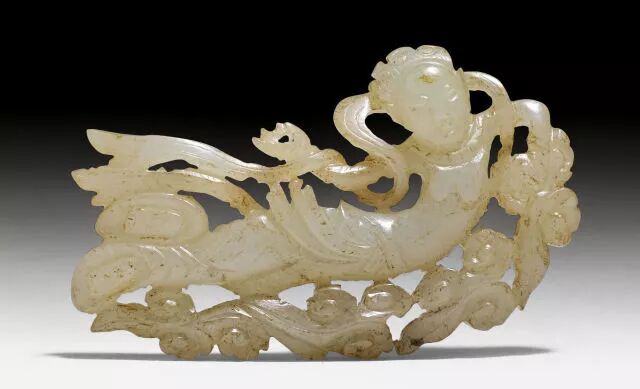 唐代/宋代时期 中国 镂空雕白褐色玉飞天摆件