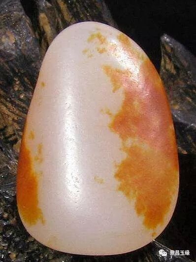 子料结构致密,皮色较浅且薄,质地疏松,皮色深且厚。皮色渗入和田玉内部由深入浅,具有层次感,过渡渐变。
