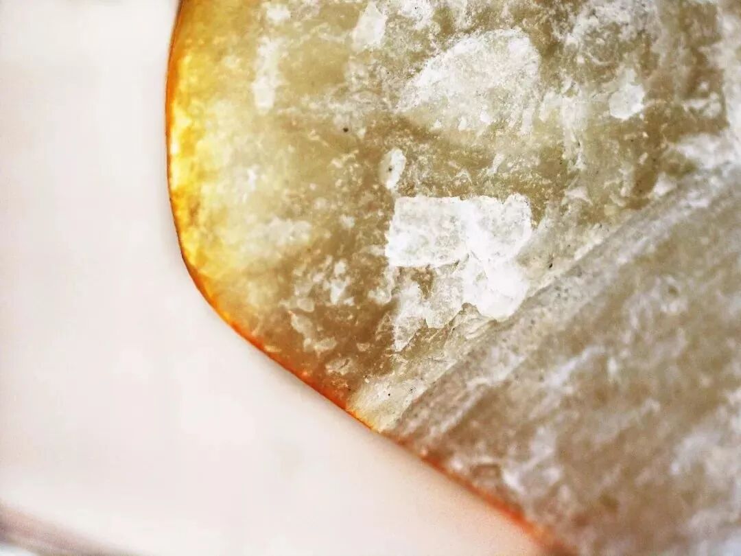 在子料表面分布的大小不一的凹坑,称为“汗毛孔”。“汗毛孔”和和田玉的质地相关,和田玉质地较细腻,则毛孔细小,分布均匀;反之,质地粗糙,毛孔粗大,杂乱分布。这些凹坑形态各异,且边缘过渡平缓。